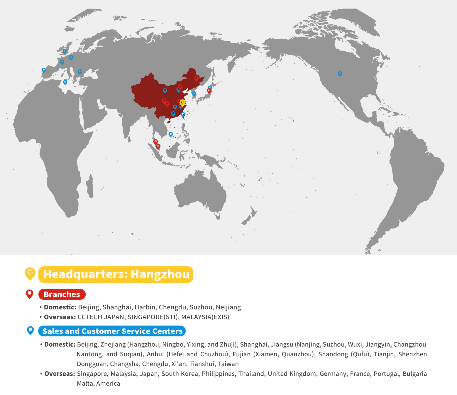 The headquarters of CCTECH is located at No. 500 Chuangzhi Street, Binjiang District, Hangzhou. At present, CCTECH has more than 4,000 employees, with more than 50% R&D personnel. It has branches in Japan, Shanghai, Beijing, Chengdu, Harbin, Suzhou, Neijiang, Changsha, Hefei and more, and has successively acquired Singapore AOI equipment manufacturer STI, the semiconductor business department of SATO in Japan and Malaysia test equipment manufacturer EXIS. With major markets in mainland China and Taiwan, CCTECH has also gradually expanded into international markets including the United States, the United Kingdom, Germany, South Korea, Singapore, Malaysia, Thailand, the Philippines and other countries.